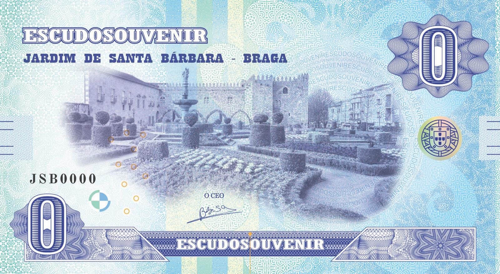 Descubra a Escudo Souvenir dos Jardins de Santa Bárbara — uma nota que celebra a beleza e o património de Braga num tributo à arte e à natureza.