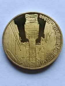 Fabricada com precisão e atenção aos mínimos detalhes, essa medalha reflete a rica herança cultural de Lisboa. De um lado, você encontrará o majestoso Castelo de S. Jorge, símbolo da história duradoura da cidade. Do outro, o Elevador de Santa Justa, um exemplo impressionante da arquitetura neogótica que continua a atrair visitantes do mundo todo. Cada face foi cuidadosamente gravada para capturar a beleza e o espírito desses dois marcos lendários.